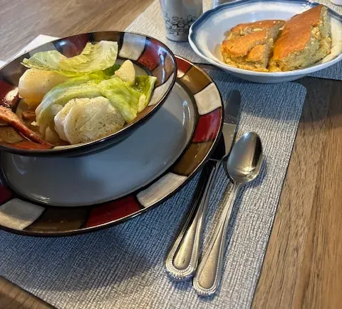 Ham, potatoes, and cabbage is such an old favorite. You can leave the skins on the taters. I usually use reds, but any type will do. The broth is seasoned with the ham, and of course, years ago, Gram used the ham bone for flavor. With Easter, that may be so timely.